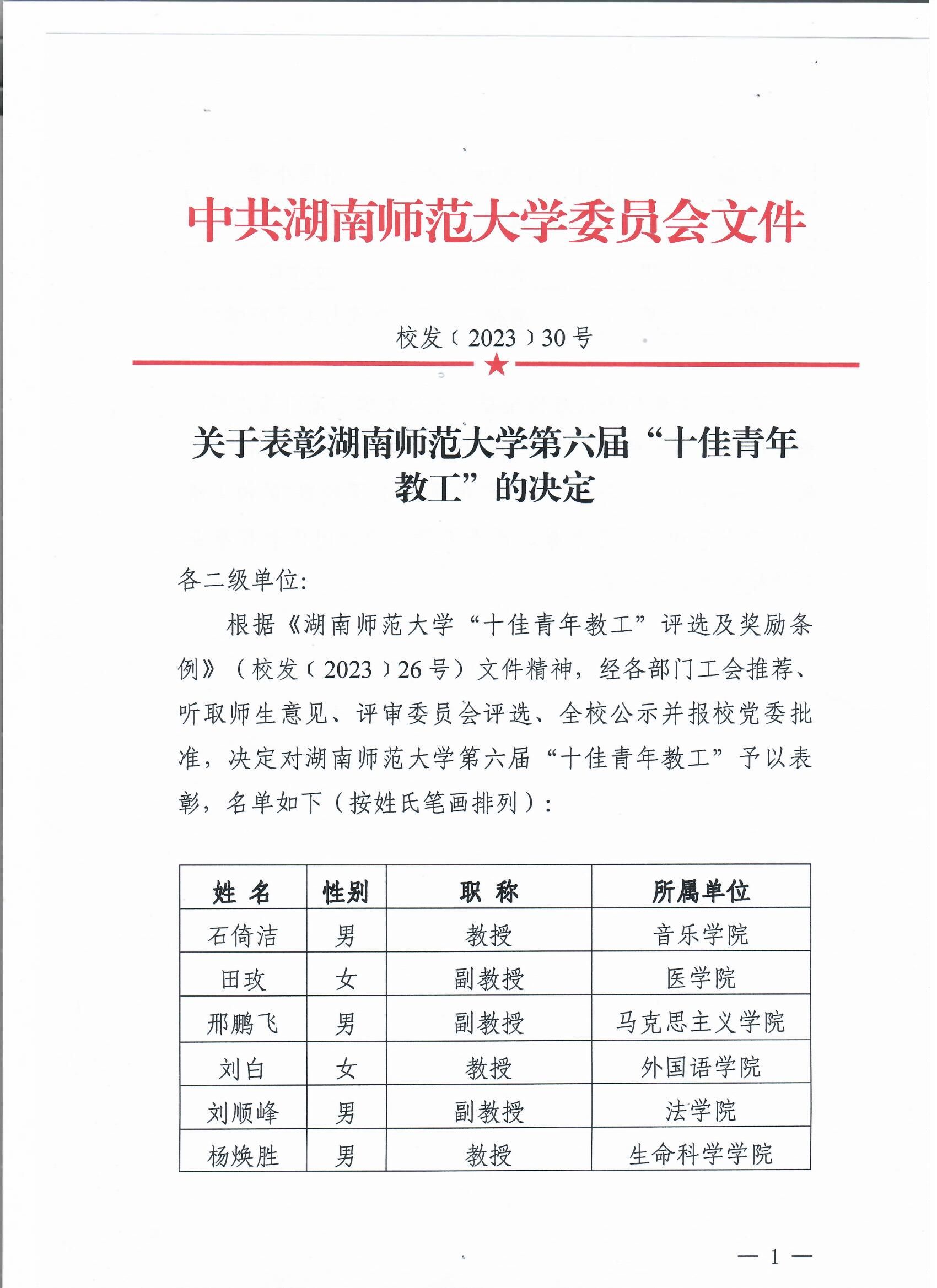 关于表彰太阳集团tyc151第六届“十佳青年教工”的决定