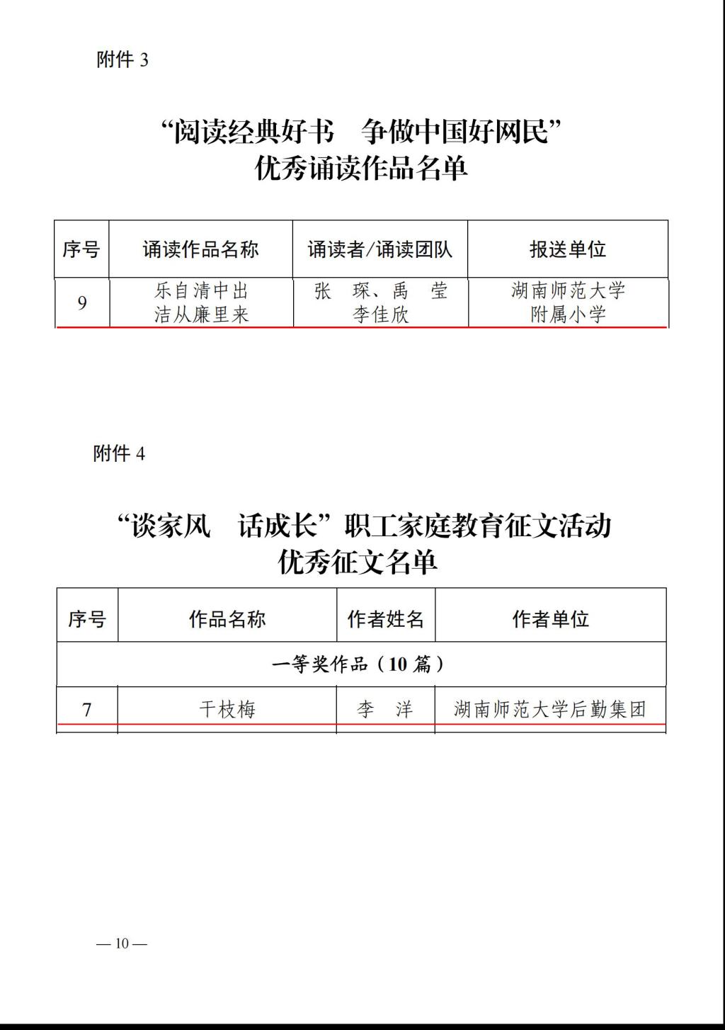 玫瑰书香为湖南省总工会女职工委员会在全省范围开展女职工主题阅读活动,旨在进一步做好女职工思想政治引领工作、促进女职工素质提升、持续推进家庭文明建设,引导女职工爱读书、读好书。该活动2022年7月启动以来,校工会积极组织,利用各种平台,举办了一系列与学校文化建设、家风家教传承和自身素质提升相结合的线上线下阅读活动,征集了一批有思想、有内涵、有深意的教职工阅读成果并上报上级工会组织进行评选。经过初评推荐、校工会组织专家评选等程序,校工会报送的征文干枝梅》(作者:李洋 单位:后勤集团) 谈家风 话成长职工家庭教育征文活动优秀征一等奖;报送的原创诵读作品《乐自清中出 洁从廉里来》诵读者:张琛 禹莹 李佳欣 报送单位:湖南师大附小)荣获阅读经典好书 争做中国好网民优秀诵读作品