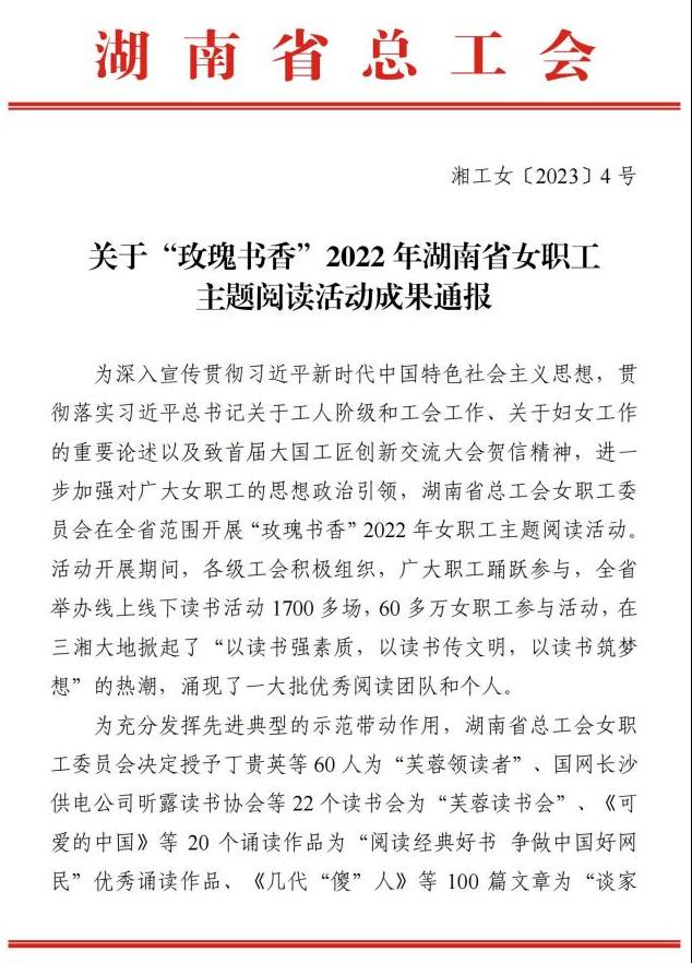 日前,省总工会发文对湖南省2022年玫瑰书香女职工主题阅读活动阅读成果评选结果进行了通报,我校报送的征文、诵读作品分别荣获一等奖及优秀诵读作品奖。