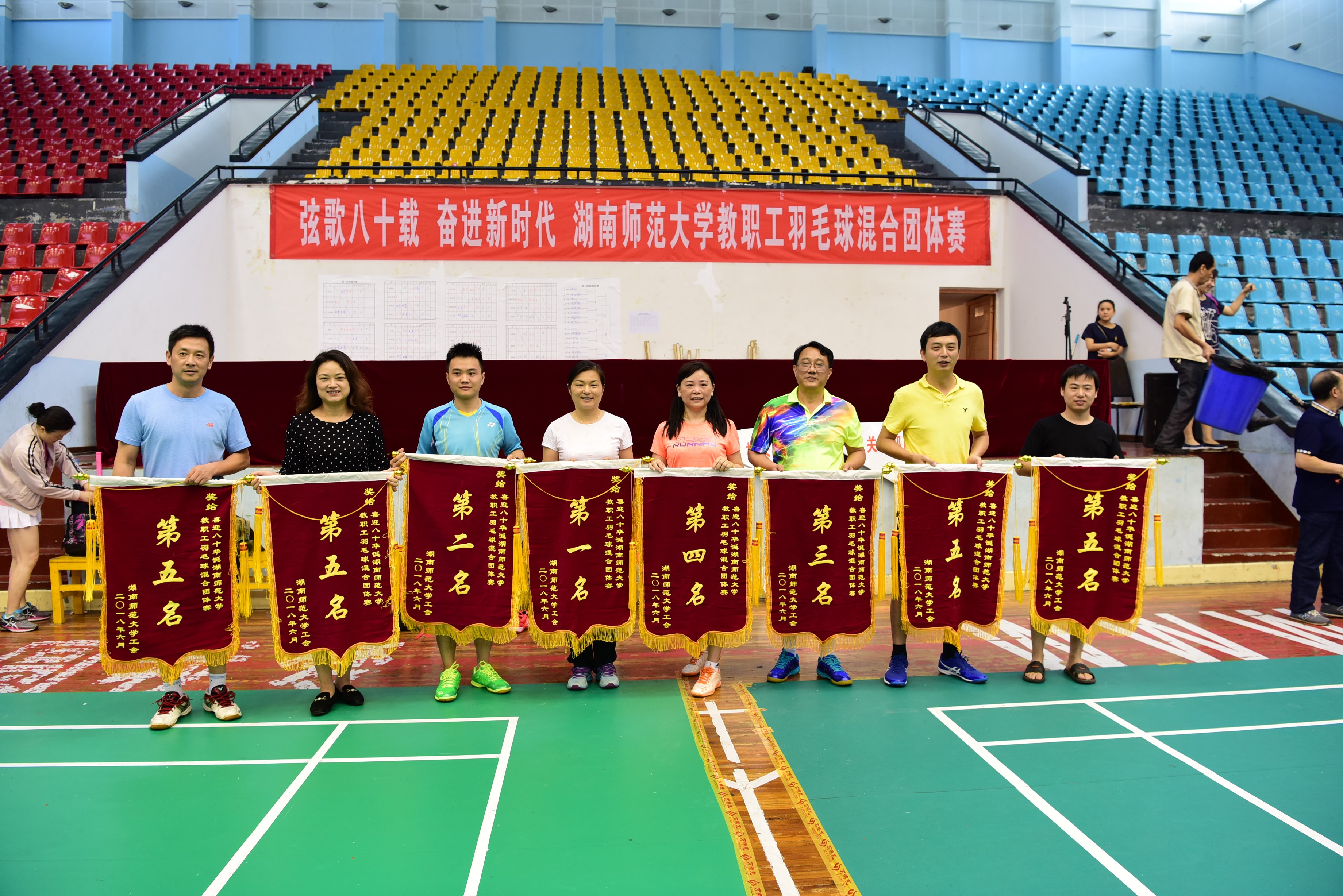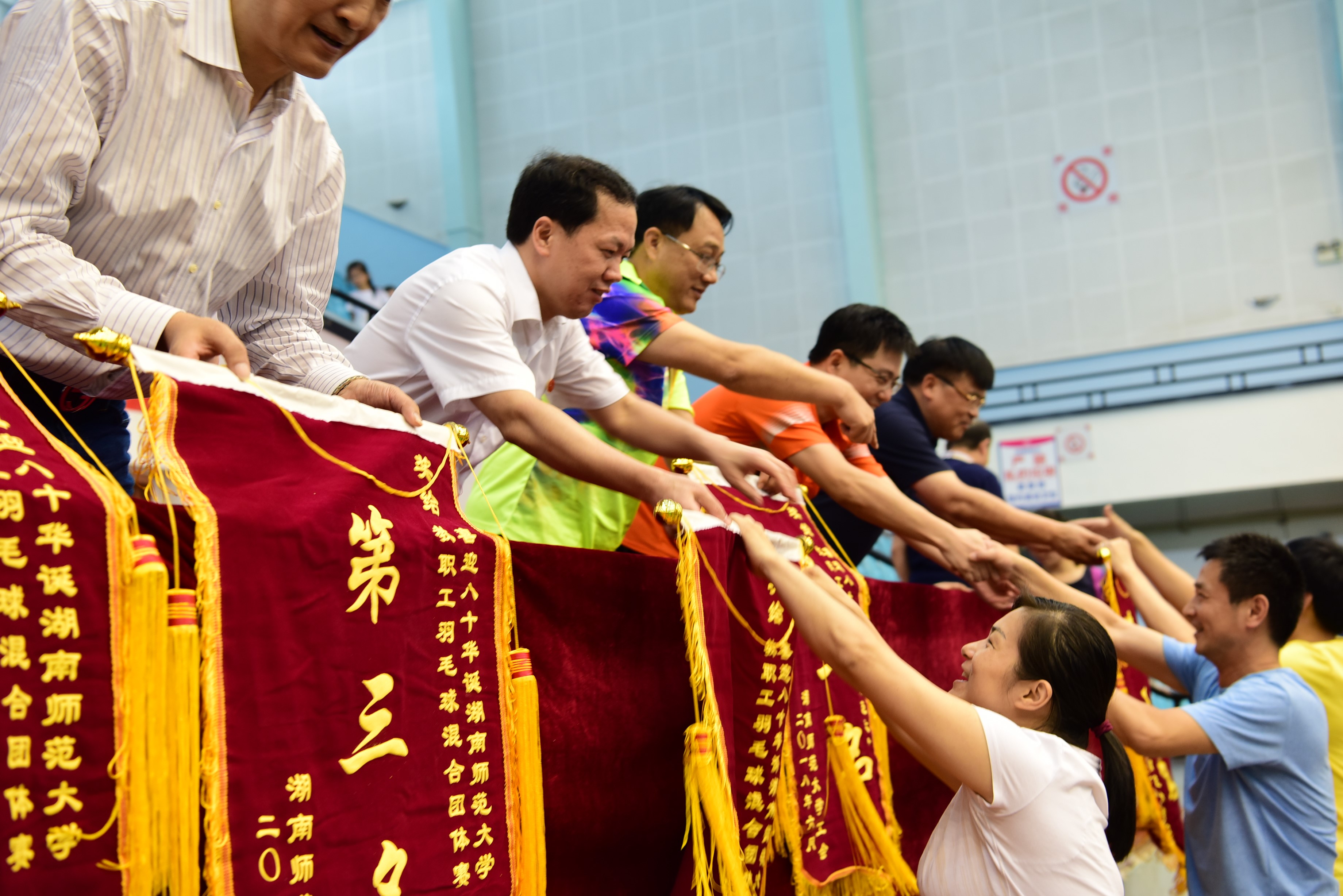 经过激烈的角逐,比赛于6月3日下午圆满落幕。总裁判长张卓瑛宣布比赛成绩。刘起军、体育学院院长汤长发、校发展规划处处长杨震、校信息化办公室处长陈宇、校图书馆党委书记鄢朝晖、校后勤集团党委书记龚向明、湘东医院党委书记王志明、师大附中副校长陈迪勋为获奖单位颁发锦旗。
