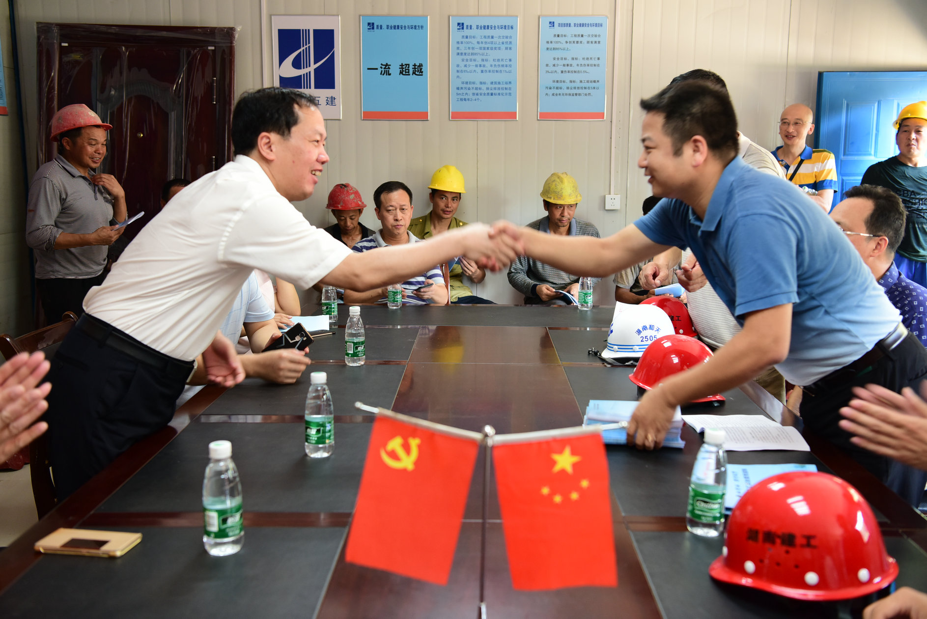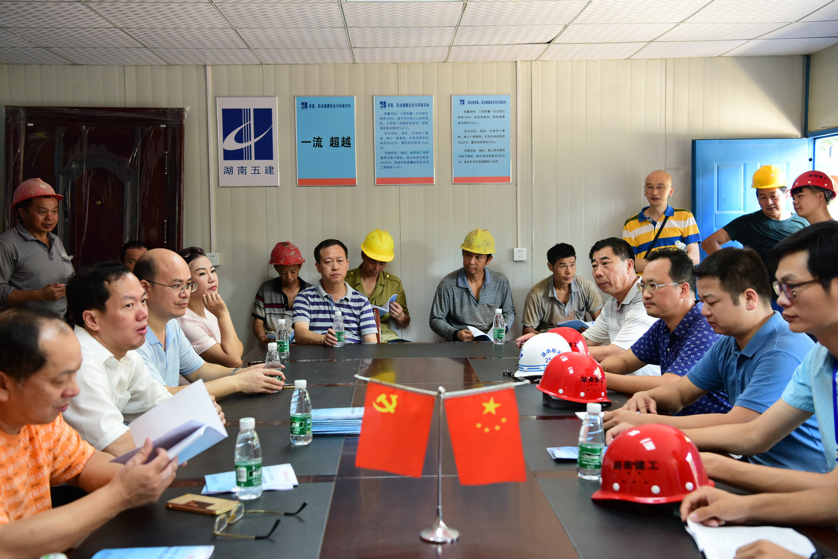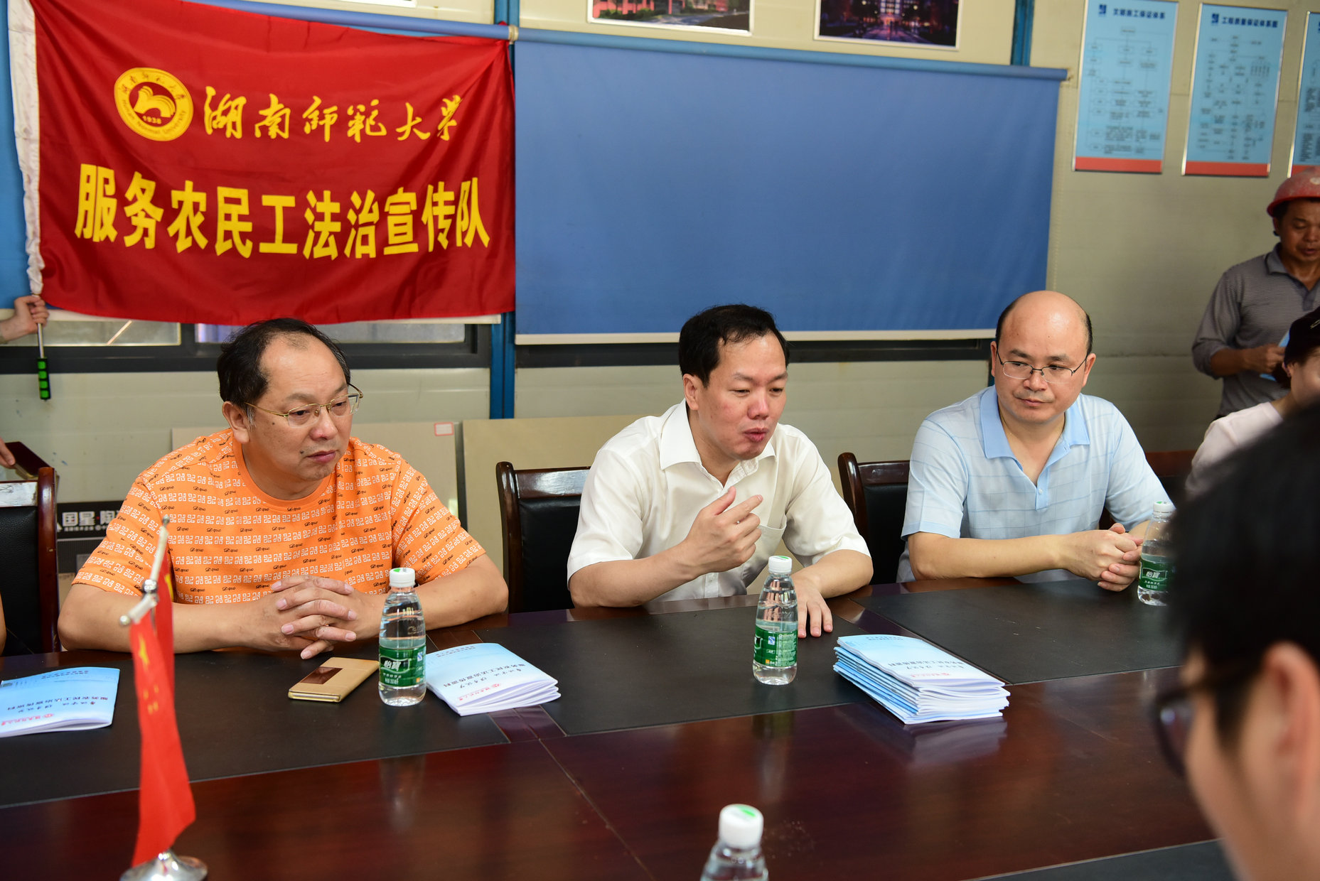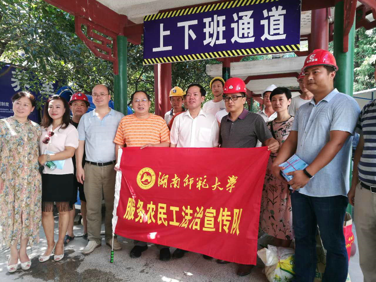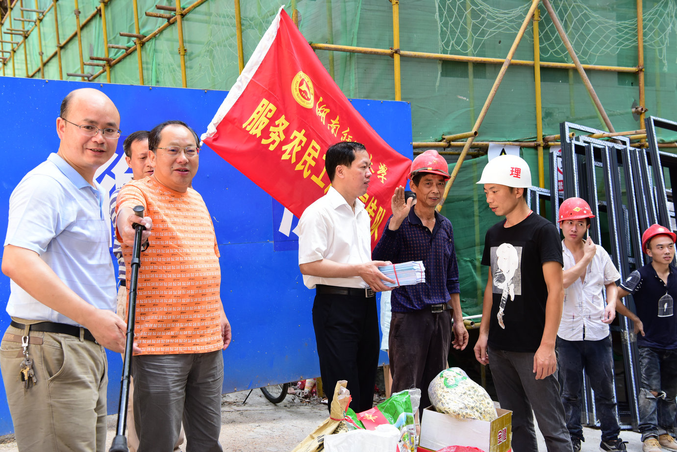 根据全国总工会和教育部总工发《关于联合开展“尊法守法·携手筑梦”服务农民工法治宣传行动的通知》(〔2017〕9号)精神。受省教育工会委托,我校作为湖南省3所参与法治宣传的高校之一,专门成立了服务农民工法治宣传领导小组,7月26日上午,顶着酷暑,校党委副书记、工会主席、领导小组组长刘起军率领工会服务农民工法治宣传队赴实训楼、理化楼和附小教学楼施工现场对农民工进行法治宣传并慰问。