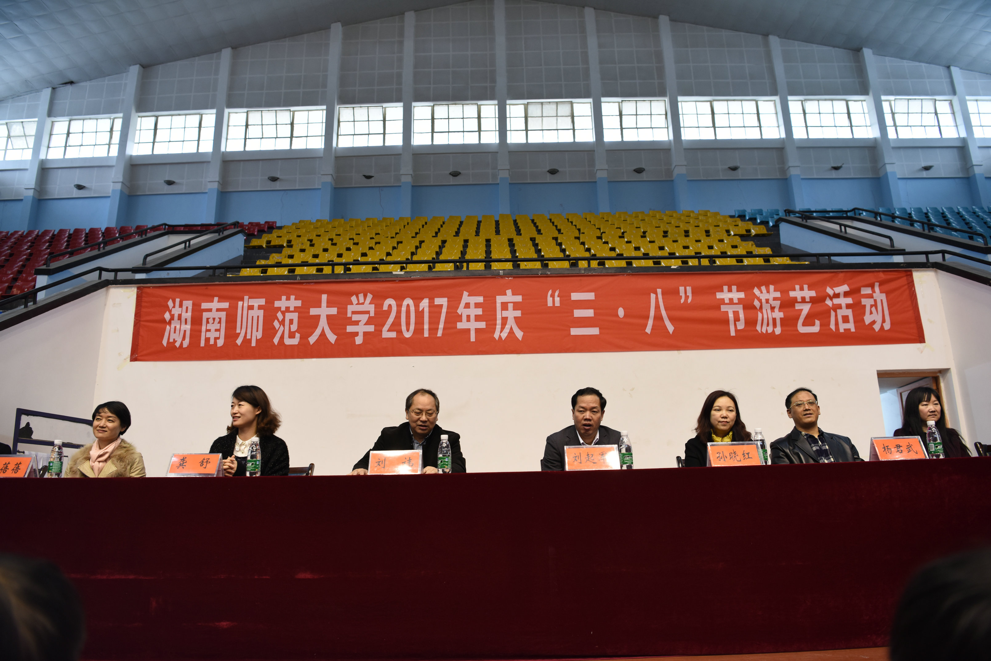 (通讯员 肖娟)“人间三月芳菲尽,师大靓女乐翻天。”为进一步丰富我校女教职工的业余文化生活,活跃团队气氛,展示女性风采,3月9日下午2点,我校庆“三•八”节游艺活动在体育馆举行。省教育工会女工委主任孙晓红,省教育工会女工委委员胡雁红,校党委副书记、校工会主席刘起军,校工会兼职副主席杨君武教授,校工会常务副主席刘祎等出席活动,校工会副主席杨格花主持开幕式。