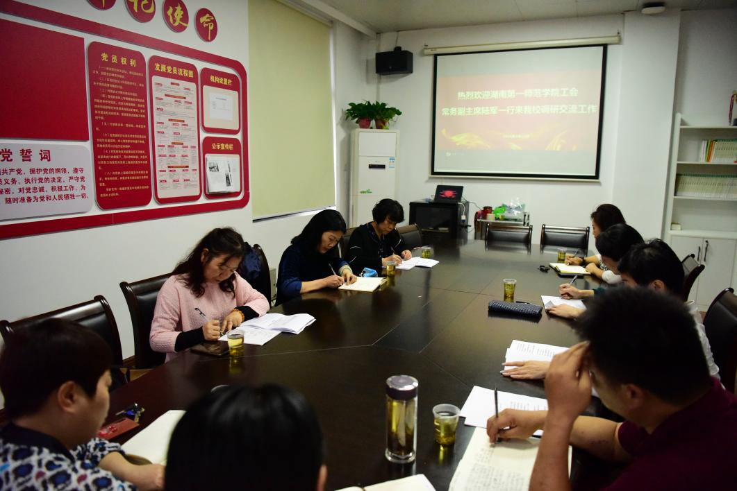 5月25日下午,湖南第一师范学院工会常务副主席陆军一行来我校工会调研交流,校工会常务副主席余英、副主席梁蓓蓓、杨格花在会议室热情接待了客人。双方进行了座谈交流,座谈会由余英主持。
