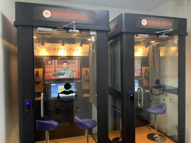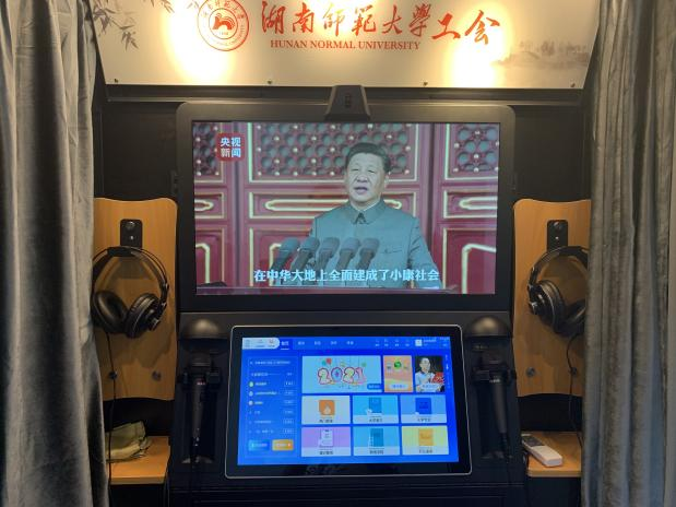 朗读亭设在校工会一楼文娱室,面向全校教职工免费开放。朗读亭内置互动屏、话筒、耳麦、高保真录音等数字化设备,融合了朗读练习、演讲训练、普通话测评、英语评测、电影配音、线上分享等丰富功能,包含党性教育、红色家书、诗词大会、经典文学选段、为你读诗等朗读文章类资源共45000余种,同时,配套提供朗读背景音乐、语言测评、安全教育等资源。此外,朗读亭还配备K歌功能,支持唱歌与朗读一键切换,十月份还将进一步升级,扩充免费曲库,线上分享等功能,更好地满足教职员工个性化的学习与娱乐需求。