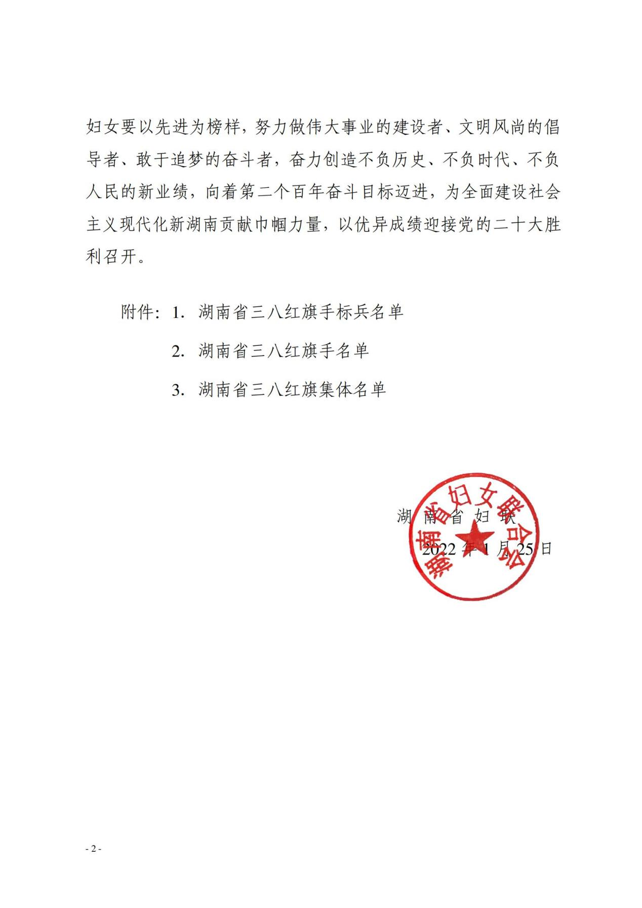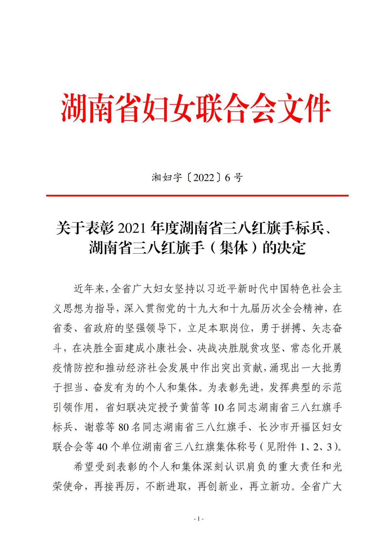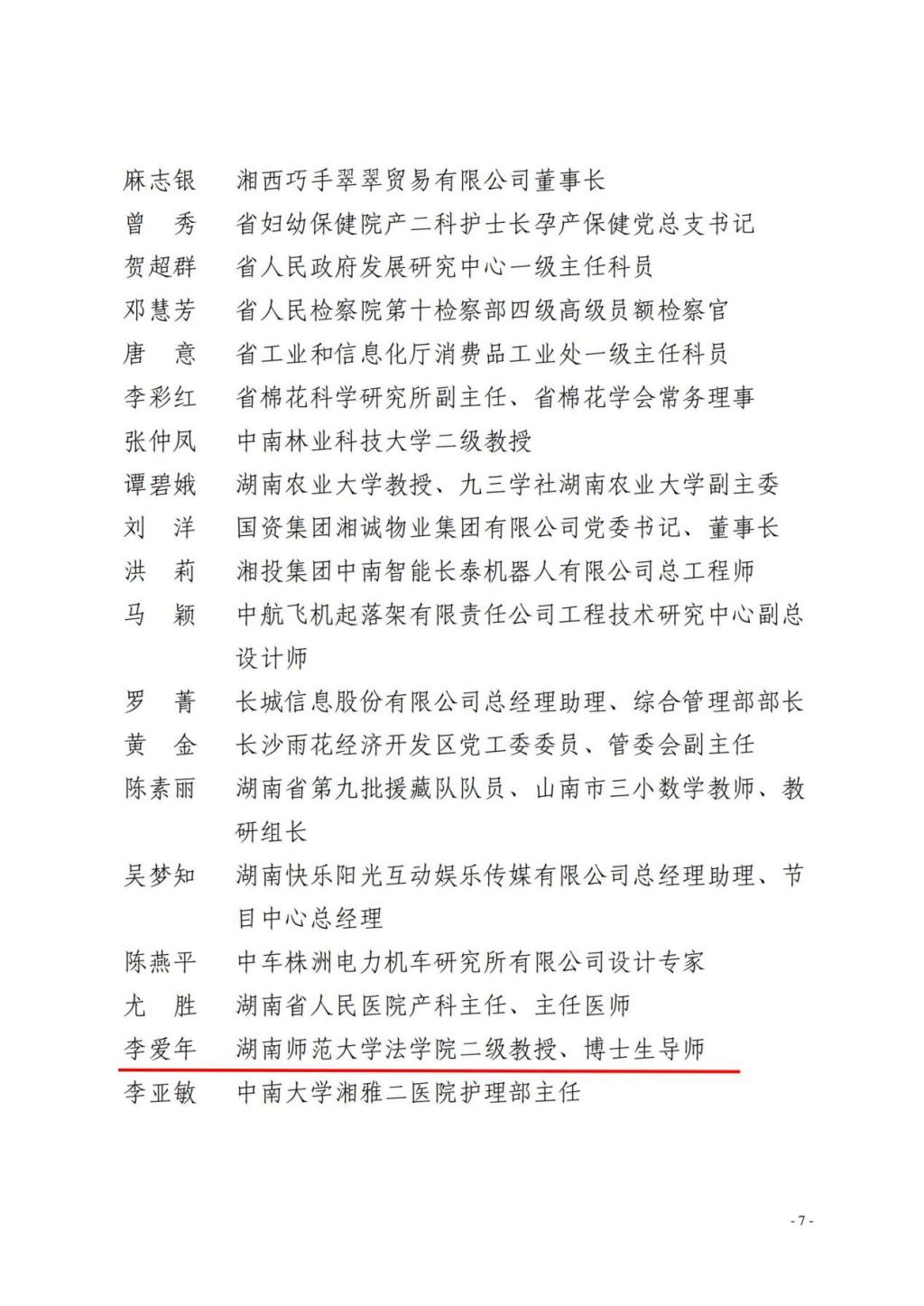 近日,湖南省妇联发布《关于表彰2021年度湖南省三八红旗手标兵、 湖南省三八红旗手(集体)的决定》(湘妇字【2022】6号), 我校李爱年教授被授予湖南省三八红旗手荣誉称号。通过组织推荐和社会评选两个途径,省妇联共评选出2021年度湖南省三八红旗手标兵10人、湖南省三八红旗手80人以及湖南省三八红旗集体40个单位。