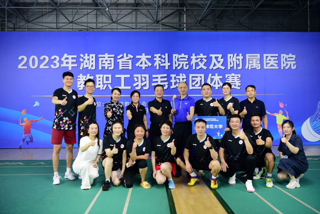5月30—31日,由省教育工会主办的2023年湖南省本科院校及附属医院教职工羽毛球团体赛在湖南人民体育场隆重举行。来自全省本科高校、附属医院共42支羽毛球队、近600名运动员参加了此次比赛。经过多轮激烈角逐,我校代表队荣膺冠军,实现了我校在该项赛事成绩的历史性突破。省总工会党组成员、省教育工会主席刘湘凌亲自为我校代表队颁奖。