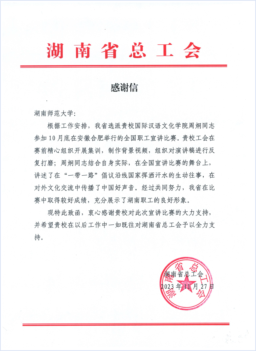 (供稿 校工会)11月27日,湖南省总工会向我校发来感谢信,对我校在全国职工宣讲活动中高质高效的组织筹备工作表示感谢,对我校青年教师出众的综合素质及所展现出的湖南职工良好形象表示高度肯定。