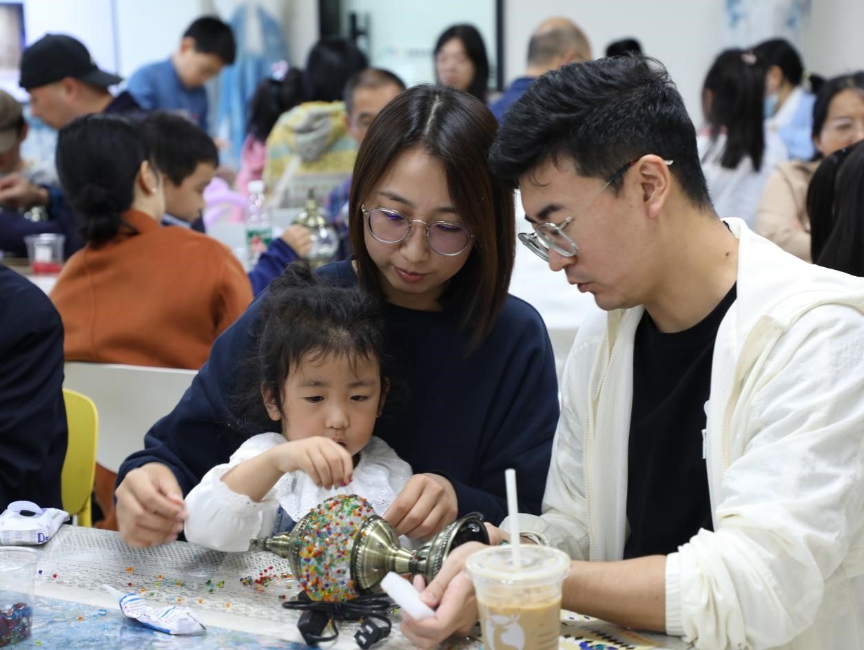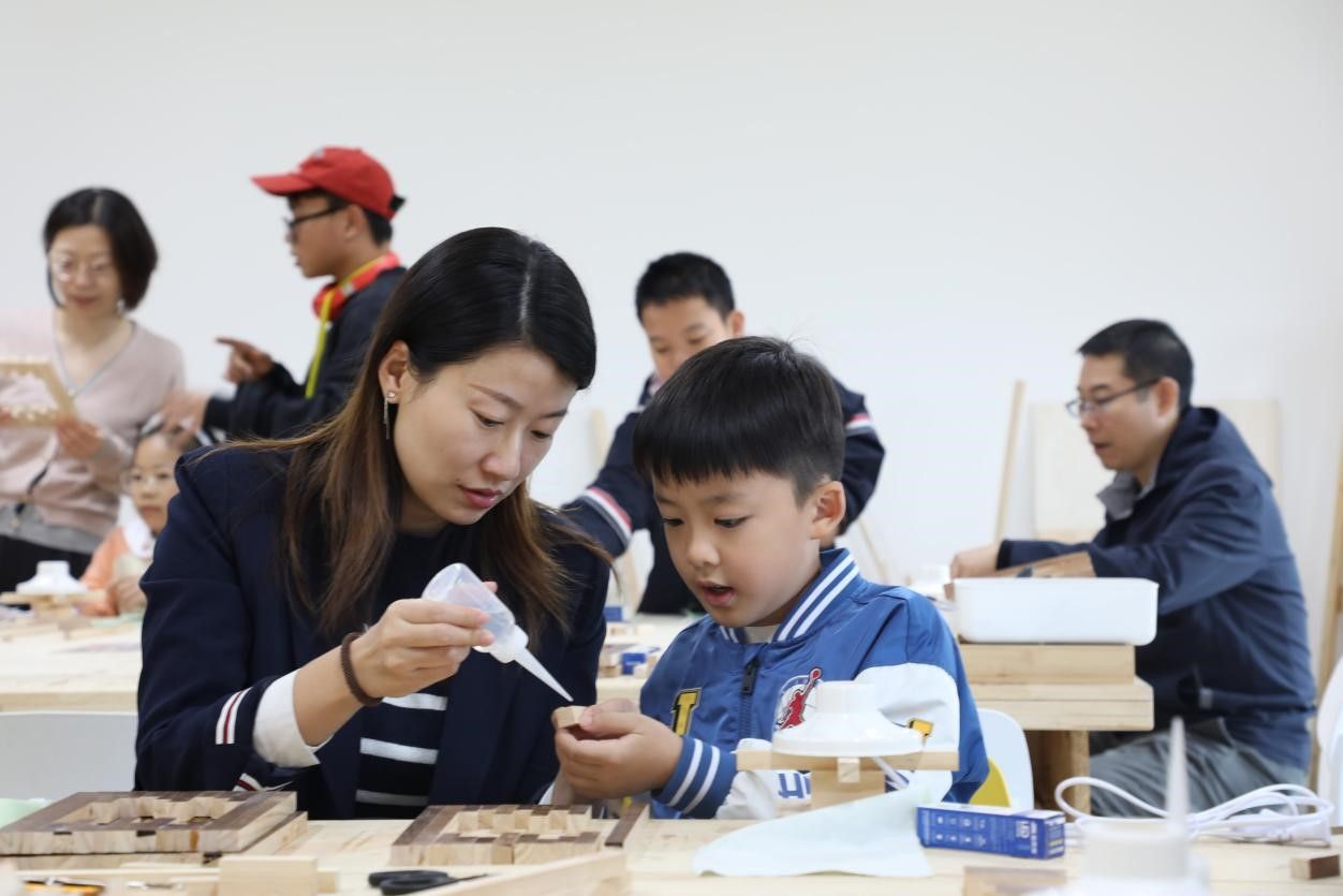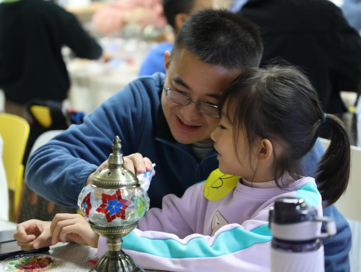 本次活动以教职工家庭为单位,根据孩子的兴趣爱好选择木艺台灯或马赛克台灯,开启亲子手动制作研学。活动开始,工作人员将木艺台灯和马赛克灯制作原材料整齐摆放在桌上,现场老师为在场人员介绍制作流程和注意事项等。制作马赛克灯现场,大家根据自己喜好挑选灯型,然后在灯罩上涂上胶水、贴成马赛克片、撒上小米珠、用湿布擦拭、用砂纸打磨,露出珠子和马赛克玻璃片,流光溢彩、变幻瑰丽的视觉盛宴呈现于大家眼前;制作木艺台灯的现场,大家首先确定台灯的设计风格,使用合适的工具将切割好的木材粘连、组装、打磨处理,将裁剪好的布料使用码钉枪装订,一盏盏亮起时营造出舒适和谐的氛围。活动中,一件件独一无二作品逐渐成型,大家互相分享各自的成果,现场一片欢声笑语,暖意融融。