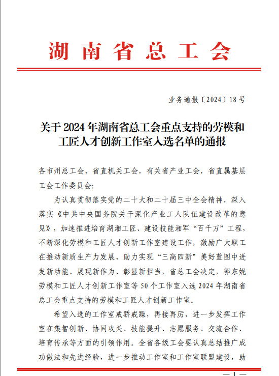 近日,省总工会下发《关于2024年湖南省总工会重点支持的劳模和工匠人才创新工作室入选名单的通报》(业务通报【2024】18号),我校曾艳钰乡村外语教育创新工作室光荣入选。
