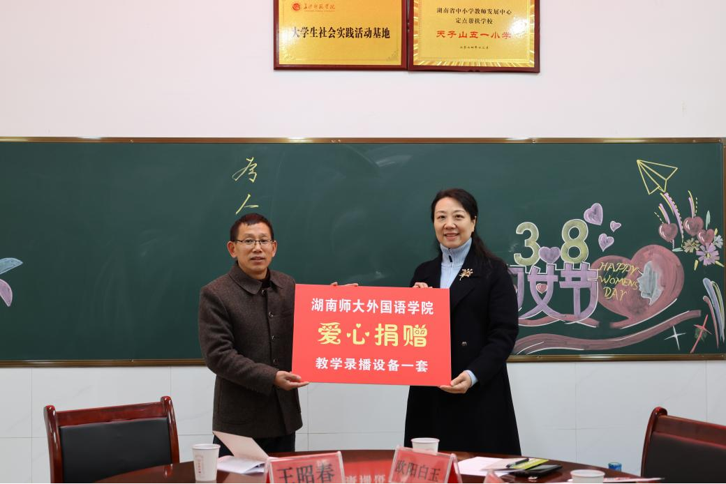 余英代表学校捐赠教学录播设备,对省总工会和省教育工会的关心指导表示感谢,对五一小学领导老师的坚守奉献表达敬意,并对乡村外语教育创新工作室多年来坚持开展送教帮扶给予高度评价。她指出,师大外国语学院、雷锋阳光小学和五一小学的教育联线,是大学联小学,大手牵小手,小学联小学,小手拉小手的有益联动,也是劳模精神在乡村振兴中的闪光体现。