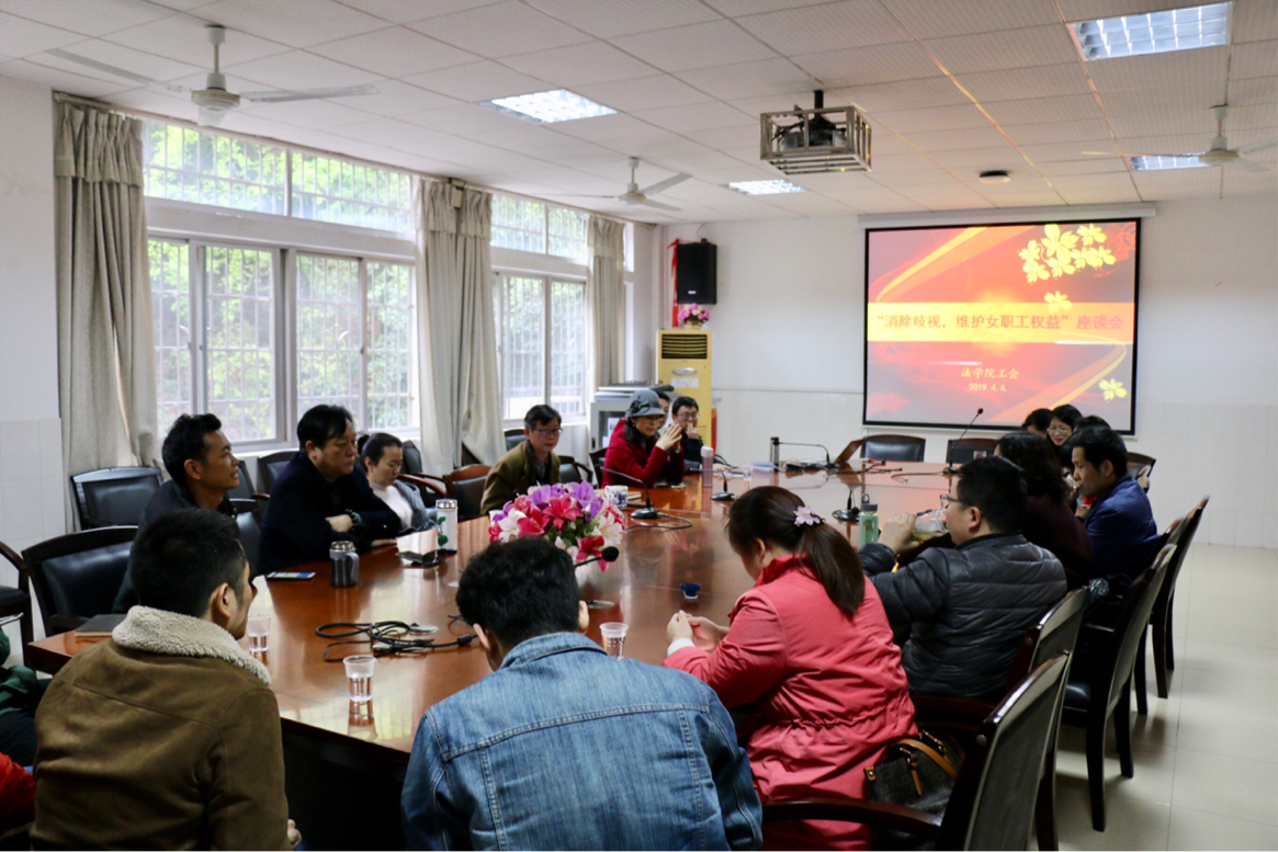 (通讯员 罗文苑)4月4日下午三点,法学院工会在学院304会议室开展“消除歧视,维护女职工权益”座谈会。法学院党委于烽书记、法学院副院长李晓玲、校工会女工委员会委员魏敏副教授出席此次会议,会议由法学院工会主席、党委副书记陈胜国主持。