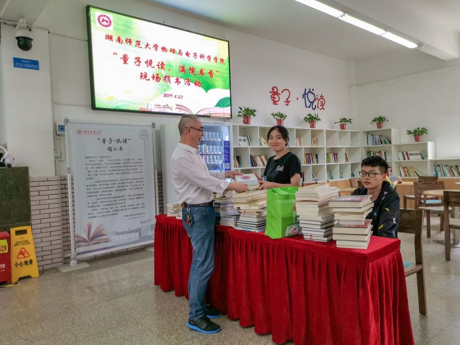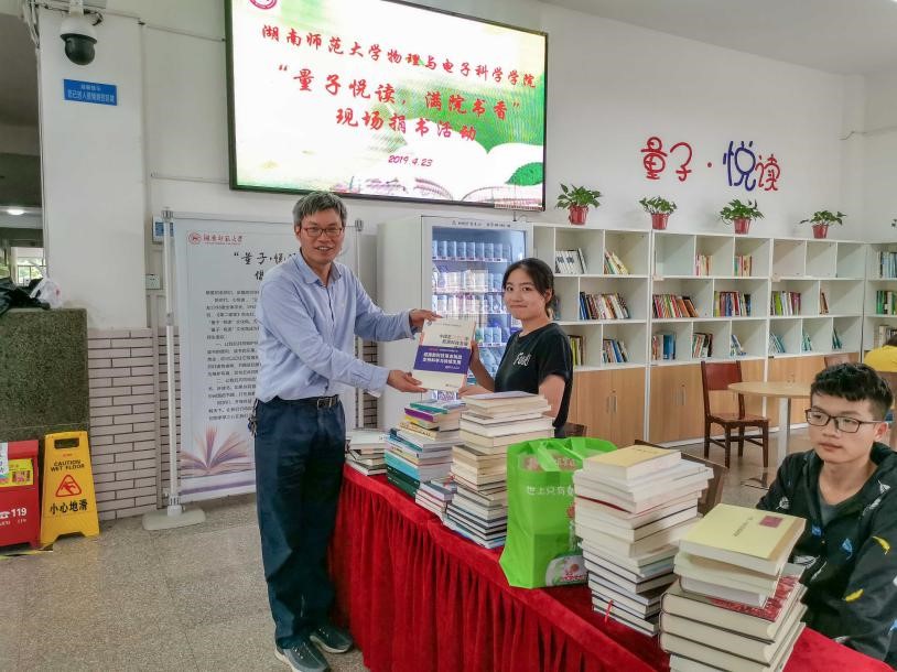 2019年4月23日下午,在第24个世界读书日来临之际,物电院在“量子悦读”功能区举行了“量子悦读,满院书香”教职工捐书仪式。本次活动由物电院工会主办,校科技处副处长邹永星、院党委书记康洪、院长唐东升、副书记谈方、副院长李友明、工会主席刘红荣出席捐书仪式。