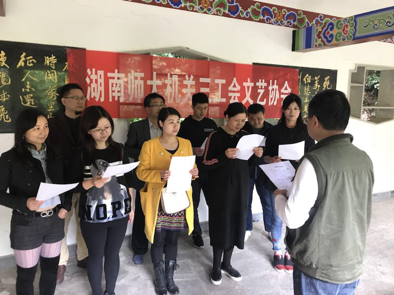 10月23日中午,为迎接80周年校庆,弘扬校园文化,营造热烈喜庆的节日氛围,机关三部门工会文艺协会在岳王亭景区艺术长廊组织会员开展“唱校歌、迎校庆”活动。活动由副会长、资产与实验室管理处何小芳组织。