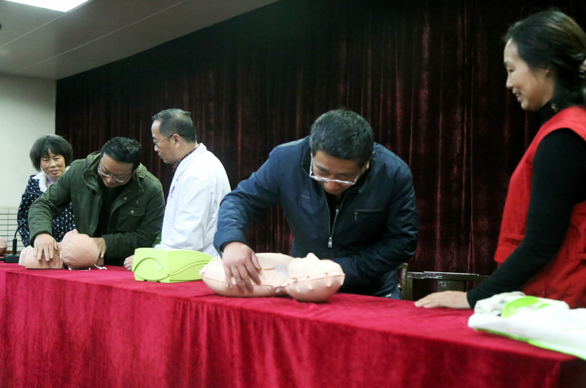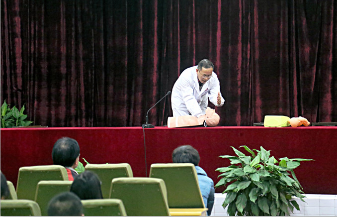 讲座内容主要包括心跳呼吸停止、气道异物梗阻、烧烫伤、淹溺、狗咬伤等几种常见的受害现场救护,着重讲解了心肺复苏的处理方法,介绍了心脏自动体外除颤仪(AED机)的使用方法,并进行了现场急救演示。
