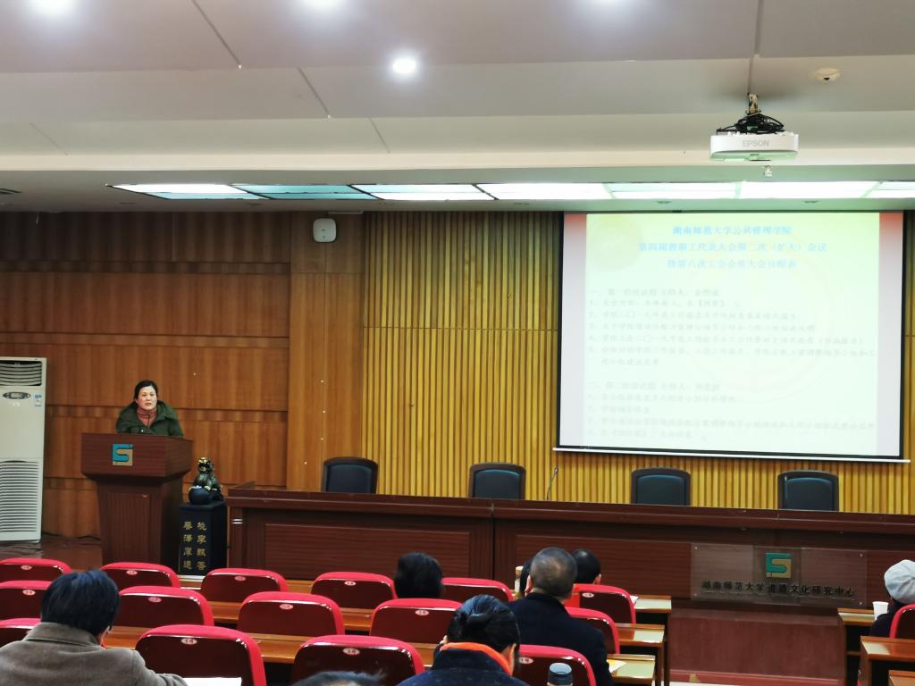 (通讯员彭少峰)12月20日下午2:30,公共管理学院第四届教职工代表大会第二次(扩大)会议暨第八次工会会员大会在学院三楼报告厅举行。院长毛新志、院党委书记余望成、党委副书记孙雯波、副院长邝洁出席了会议。会议第一阶段由余望城主持,第二阶段由孙雯波主持。