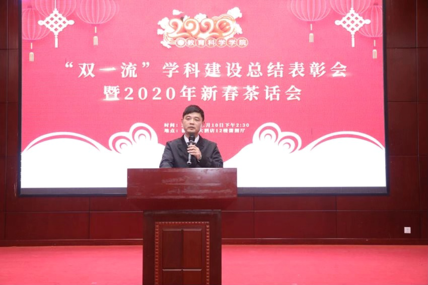 (通讯员谭梦)1月10日,教育科学学院部门工会在福盛源酒店潇湘厅举办“双一流”学科建设总结表彰会暨2020年新春茶话会。校教务处处长钟毅平,原我院党委副书记、现任邵阳市北塔区委常委、统战部部长向兵出席。