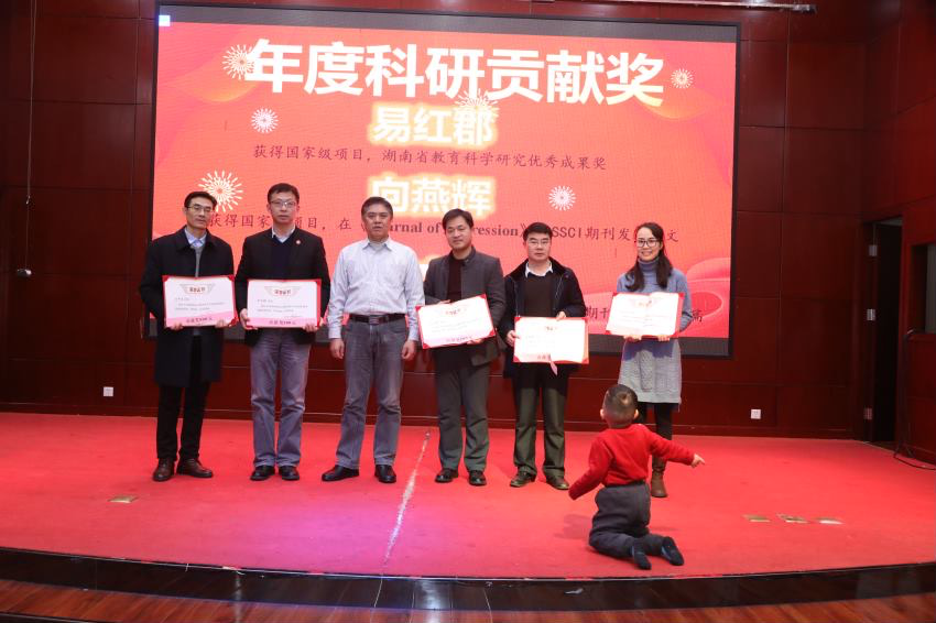 在与张楚廷老校长和在外研学教师的新春祝福视频后,会议根据教育教学篇、学术科研篇、党建管理篇等三个颁奖篇章依次进行,各篇章设有各类节目、互动游戏、教师感言、颁奖表彰及幸运抽奖等环节。
