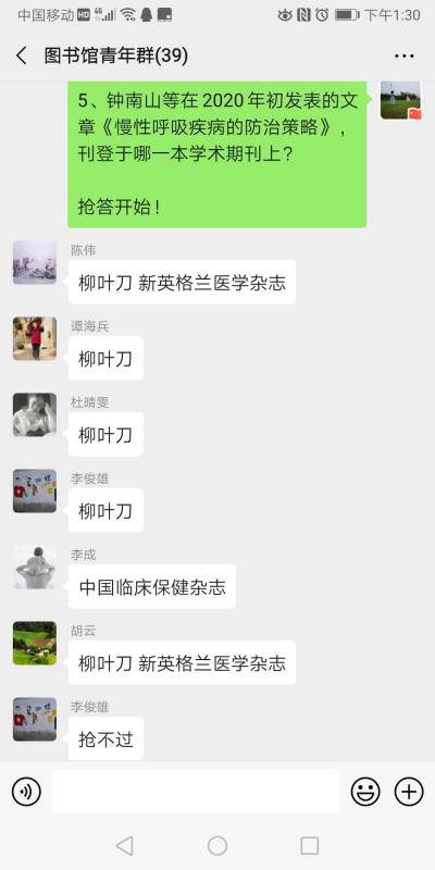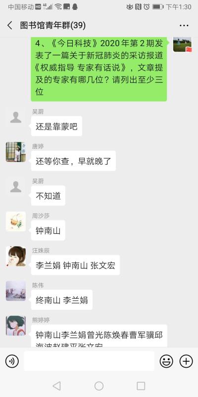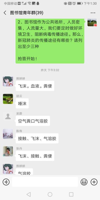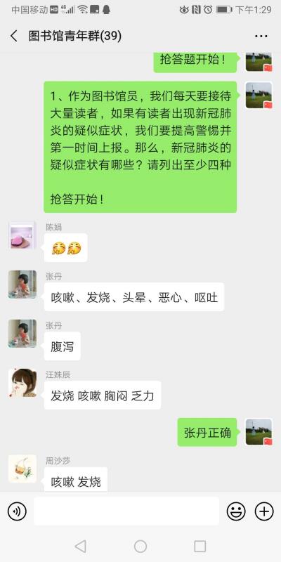 此次知识竞赛通过“青年职工微信群”和“问卷星小程序”在线上开展,分为抢答和竞答两个环节,内容涉及新冠肺炎防疫基本知识、如何科学预防感染、如何做好复学后馆内疫情防控、与疫情相关的文献检索等知识,贴近职工工作生活实际。竞赛开始后,青年老师们积极抢答,拼知识储备、比检索技能、拼网速、比手速,气氛热烈,效果明显。抢答环节结束后,老师们兴致勃勃,意犹未尽,纷纷扫码参与了竞答环节的答题。