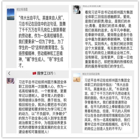 “也许你在深夜疲惫痛哭过,但天亮又打起了精神;也许你抱怨过生活的不易,但还是咬牙坚持了下去;也许因为疫情你会面对很多改变,但不变的是不停歇的脚步、不放弃的倔强。生而平凡,心向璀璨,感谢每一个努力奋斗的你!”学工工会小组2020年5月21日,一起学习了习近平总书记给郑州圆方集团职工的回信。大家纷纷表示,要立足岗位,守土尽责,为学生健康成长保驾护航,以人为本,全心全意、真心真意地为学生服务,一切以学生为根本,助力疫情防控,引导学生做好防护,健康成长,当好特殊时期学生的引路人。