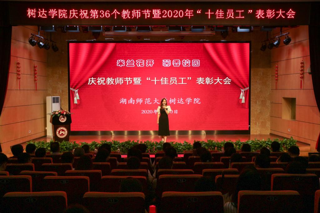 (记者李瀚刘诗琴江洲邓雪怡郑诗云李劲松许镭舰刘天冰)9月10日下午,树达学院隆重举行“米兰花开,馨香校园”——庆祝教师节暨“十佳员工”表彰大会,学校副校长、树达学院董事长周俊武,校党委委员、宣传部部长晏昱,校党委委员、统战部部长沈又红,校党委办公室主任李学荣,校长办公室主任肖新祥,校研究生院院长刘子兰,校工会常务副主席余英,湖南沁园春投资有限公司董事长赵小年,我院2001级校友、中国建材南方新材料长沙南南方副总宋彬等出席表彰大会。