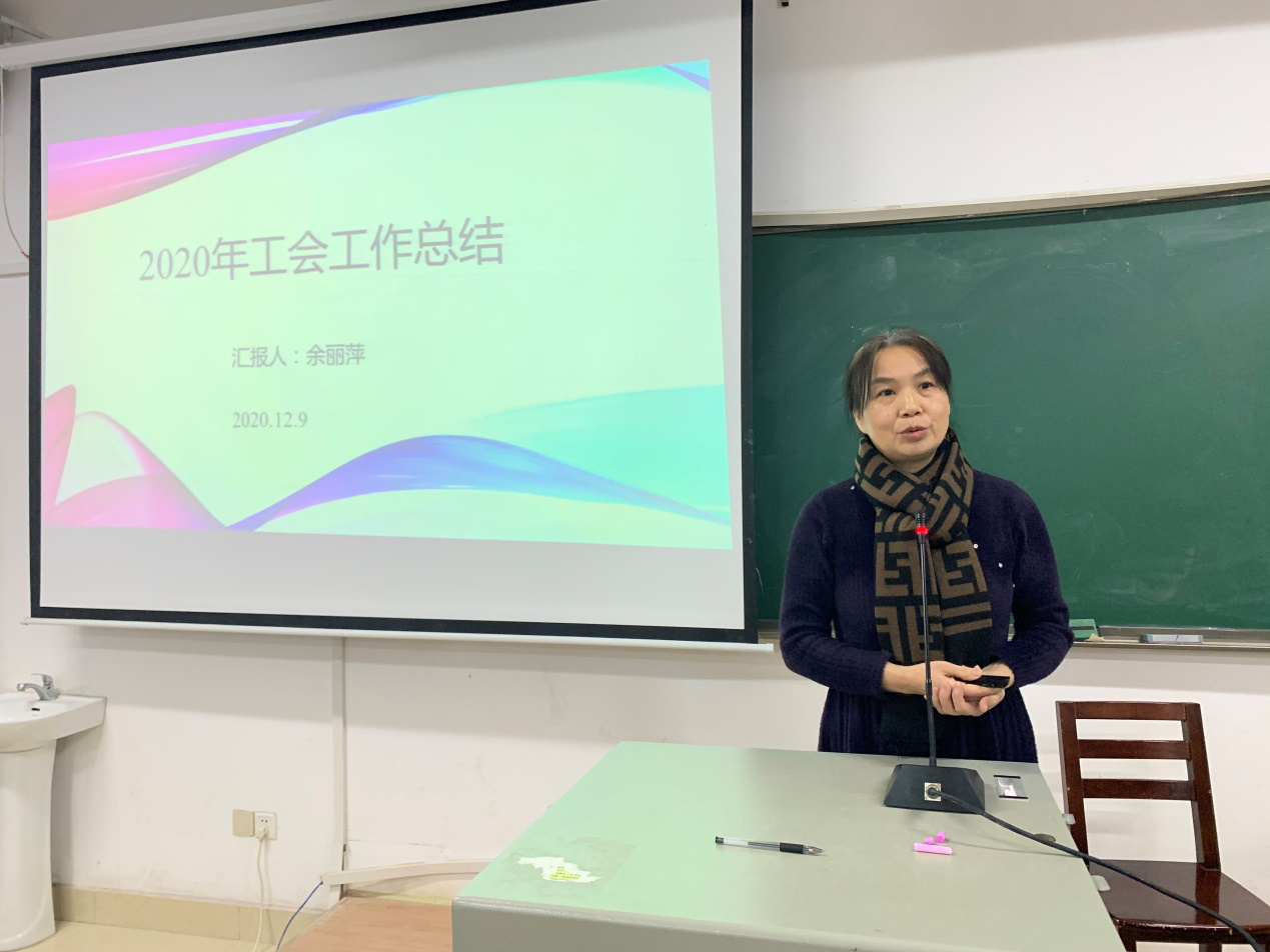 会议在庄严的国歌声中拉开帷幕。余丽萍从年度活动开展情况、抗疫学习主题教育、插柳扶贫特色工作以及关爱师生等方面作2020年院工会工作总结报告。