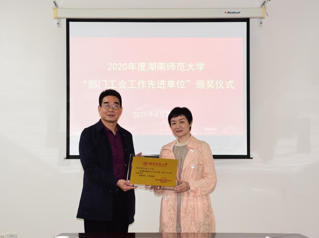 (记者刘诗琴)4月29日上午,校工会副主席梁蓓蓓在树达学院办公楼302会议室为学院颁发“部门工会工作先进单位”奖牌,院党委书记周玉波、党委副书记曾南雁出席仪式,仪式由周玉波主持。