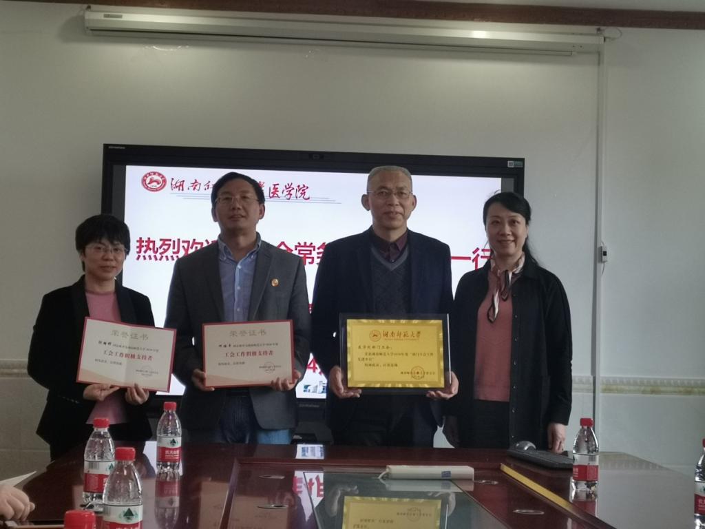 4月29日下午,校工会常务副主席余英一行在医学院办公楼4楼会议室为我院颁发“部门工会工作先进单位”奖牌,院党委书记鄢朝晖、院长何祖平出席仪式。