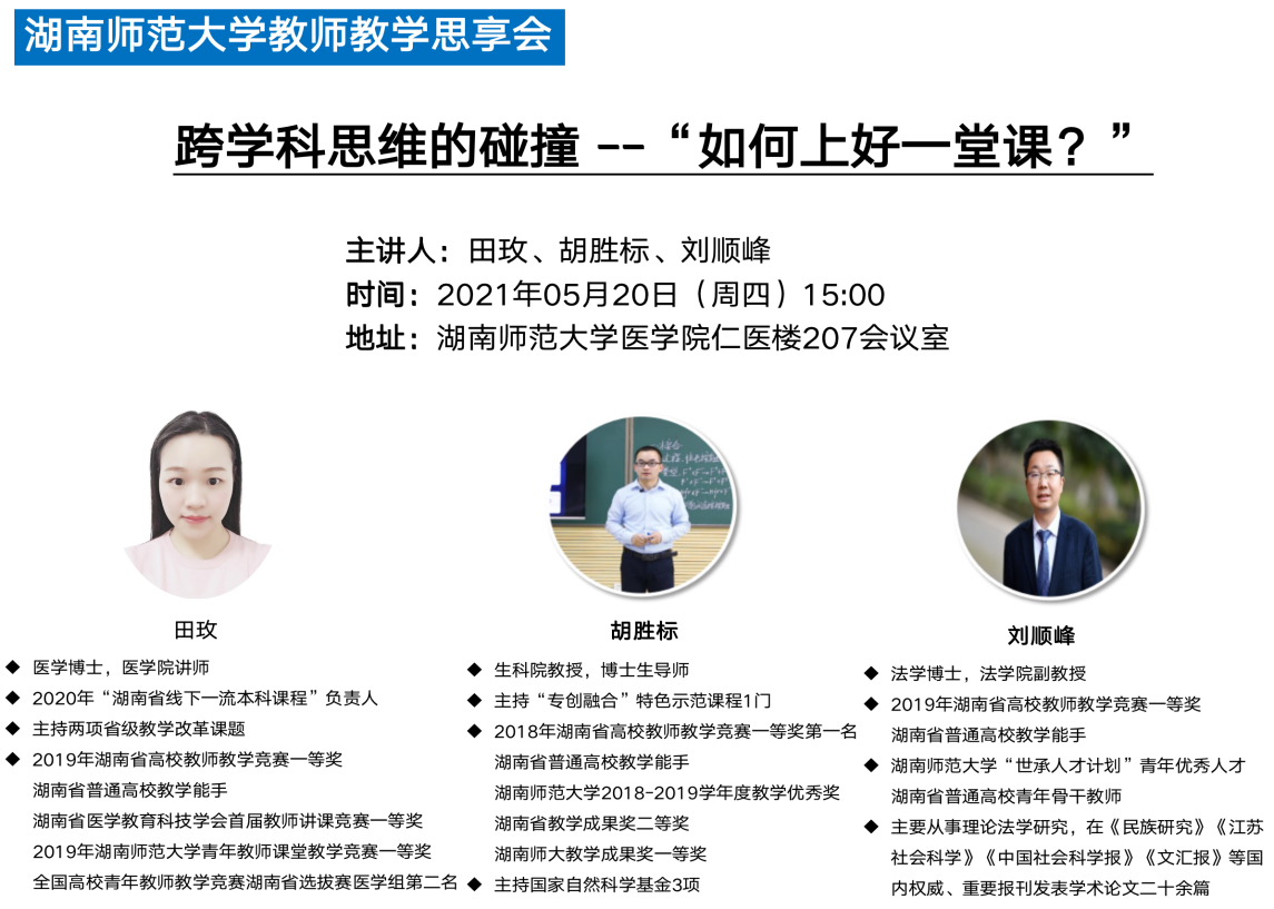 5月20日下午,学校第118期教师教学思享会在医学院仁医楼207会议室举行。此次思享会的主题为“跨学科思维的碰撞——如何上好一堂课”,由来自生命与科学学院的胡胜标教授、法学院的刘顺峰副教授和医学院田玫博士主讲,医学院教学副院长张坚松主持会议。