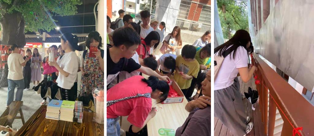 活动现场热闹非凡,浓浓的节日气氛映入眼帘,吸引了大量的学生参与其中。同学们将对家人亲友的祝福、未来的美好期盼郑重地写在祈福卡上,小心地系在连接新老食堂的同心桥上,以期美好的愿望都能实现。猜灯谜的同学更是热情高涨,积极开动脑筋破解谜底,树荫下时不时传出猜中谜底时的尖叫声与掌声。全程参与活动的一位同学拿着手里的月饼和小礼品高兴地说道:“学校太贴心了,不仅有好吃的爱心月饼,还有参与活动带来的小惊喜,真是幸福感爆棚,非常难忘!”