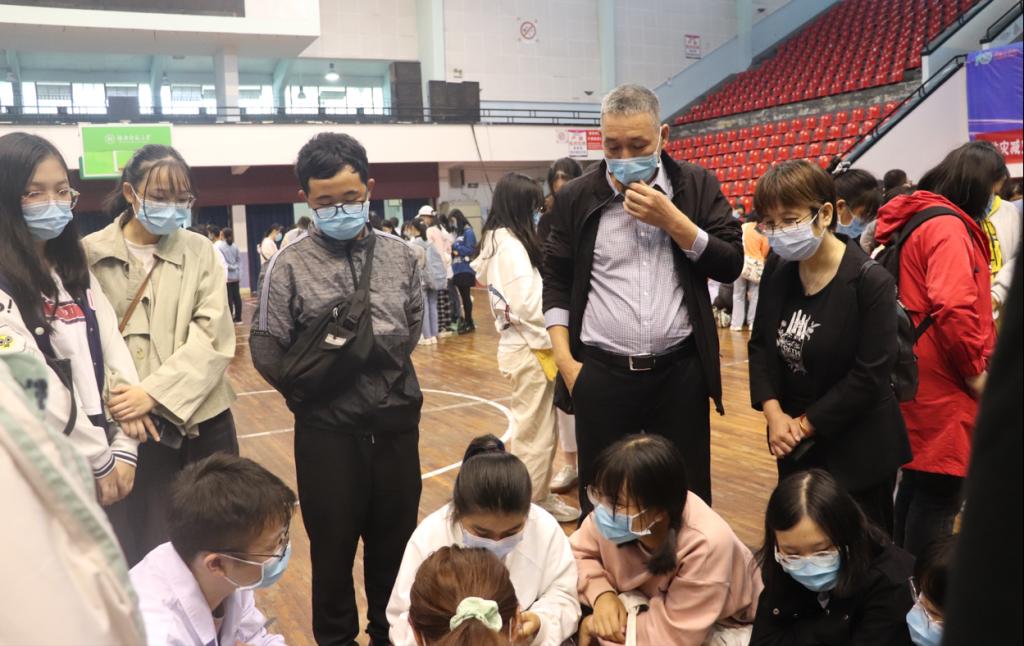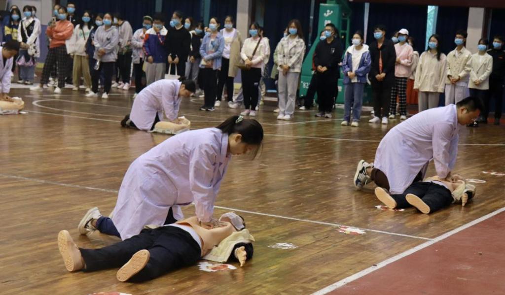 医管办副主任、校医院院长周国强、医管办党总支书记杨洁芳、长沙市第四医院副院长胡国璜等领导出席,世承书院、生科院、化学化工学院2021级新生参加本次活动。市四医院急诊急救中心主任黄艳现场讲授了心跳骤停、异物卡喉等紧急情况的现场救护知识;市四医院及校医院30余名医务人员向同学们演示了“心肺复苏术”和“海姆立克急救法”的具体步骤和注意事项,同学们积极参与其中并在专业的指导下在模型上进行了心肺复苏等实践技能训练。