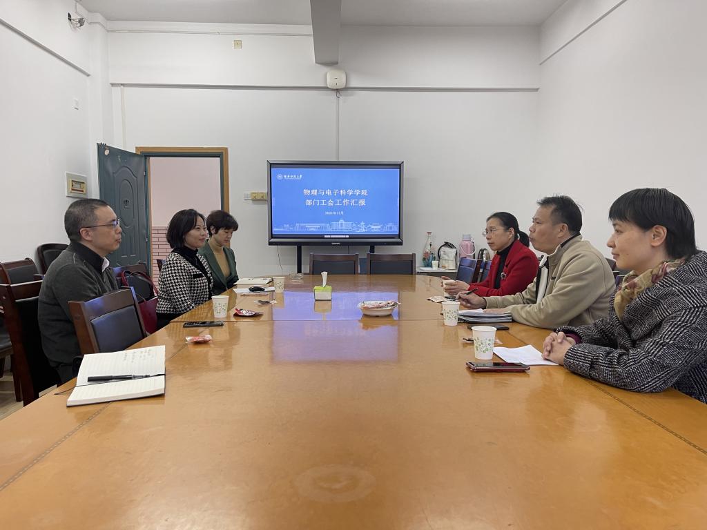 11月10日下午,校工会副主席杜汉文、邓宏霞等一行到物理与电子科学学院调研工会工作。院工会主席刘红荣教授,副主席陈涛,女工委员吴浪波参加座谈。