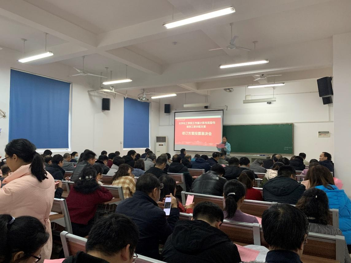 (通讯员周明波)12月9日下午,化学化工学院在117教室召开教职工大会,就工作量计算与奖励性绩效工资分配修订方案投票表决。学院院长杨荣华、院党委书记谭东波出席了此次会议,会议由党委书记谭东波主持。