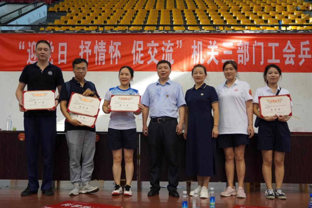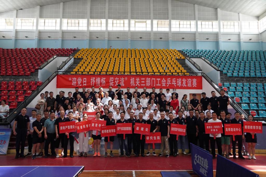 (通讯员 何小芳) 6月30日下午,在喜迎建党101周年之际,机关三部门工会在二里半校区体育馆隆重举行“迎党日,抒情怀,促交流”乒乓球友谊赛。体育学院副教授宋惠明担任裁判长。机关党委副书记彭建国、校工会副主席邓宏霞出席活动。
