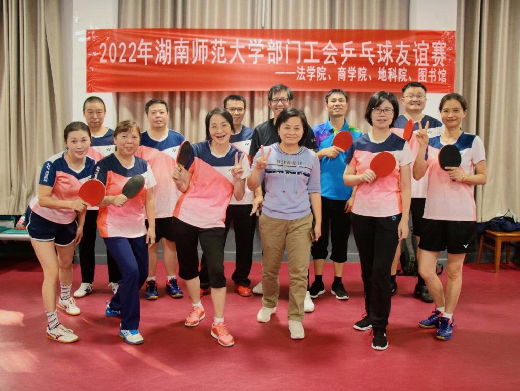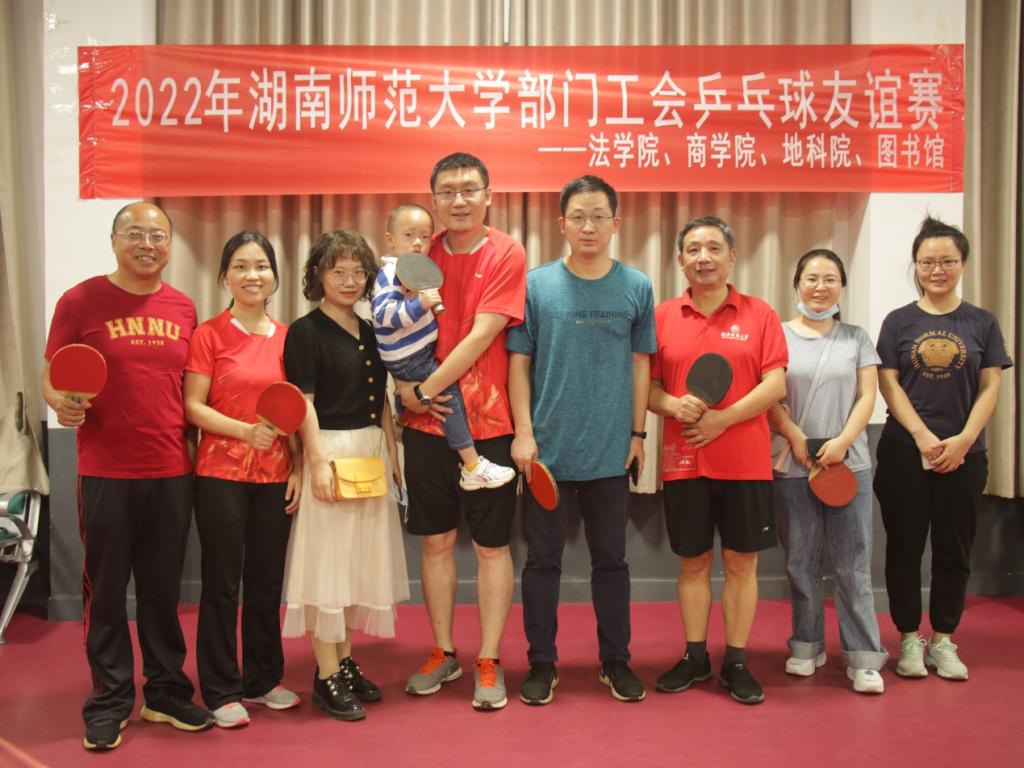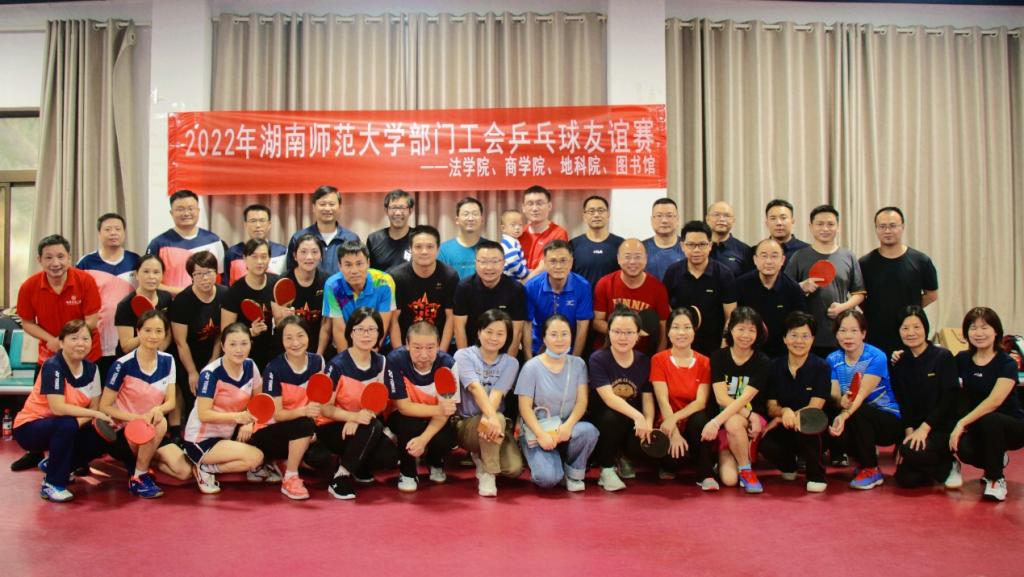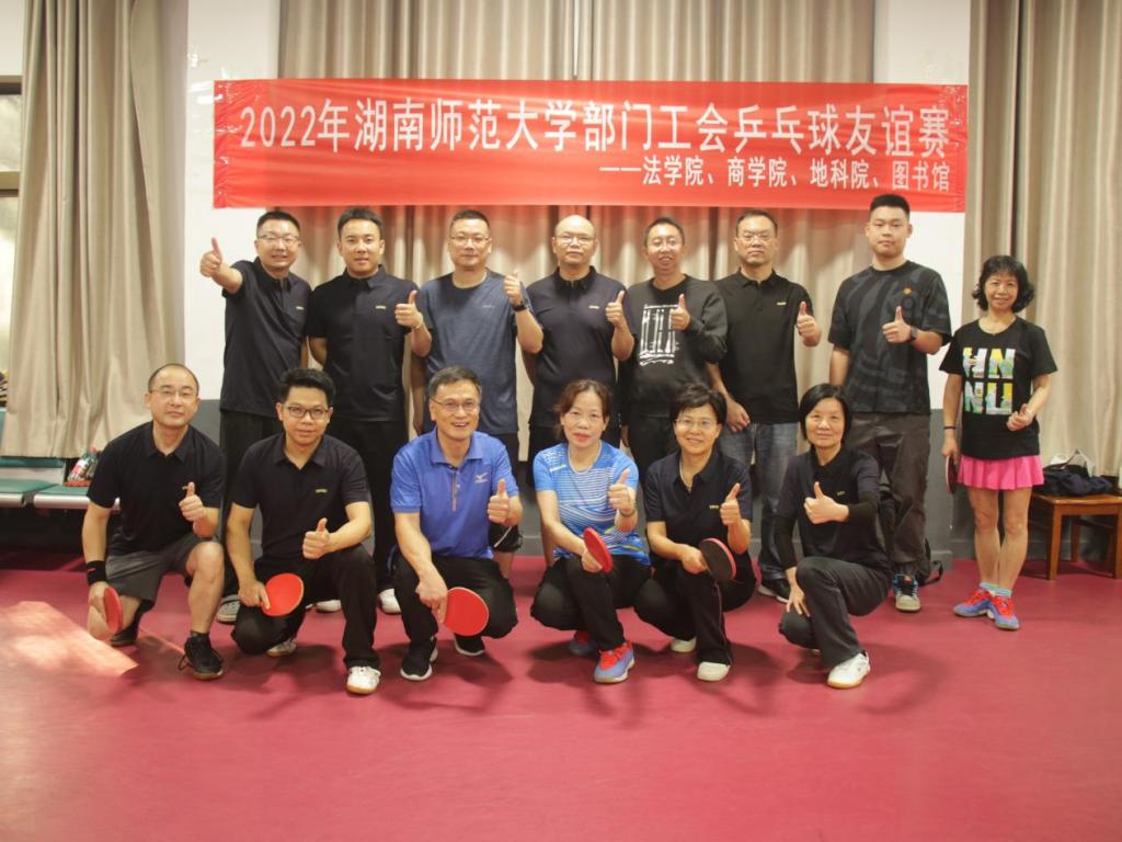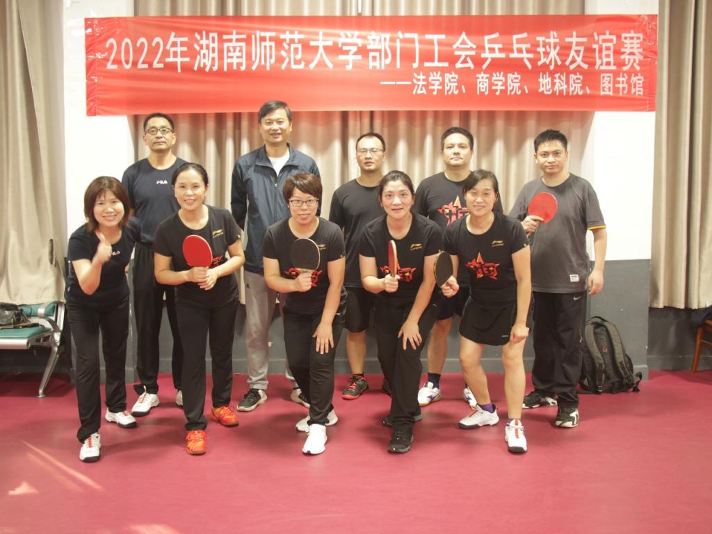 本次友谊赛由法学院,商学院,地理科学学院、图书馆部门工会联合组织,四个单位的代表队进行循环比赛,每队之间打满五场,依次为男子单打、女子单打、混合双打、男子双打、女子双打,每场三局两胜制。