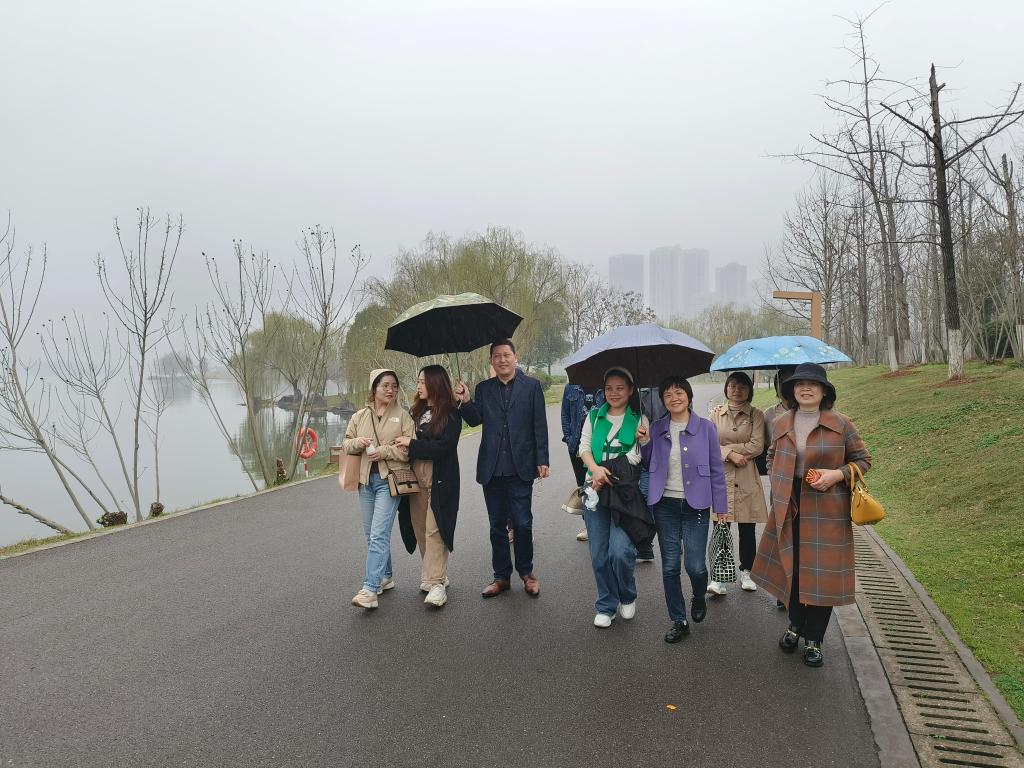 中午用餐过后,学院领导同事和女教职工们齐聚西湖公园,围绕湖边漫步,欣赏春意盎然的沿湖美景。虽然天空中下着细雨,但却给这眼前的美景蒙上了一层朦胧的意境,烟水空蒙,碧波荡漾,别有一番风味。大家撑着雨伞漫步,亦或停下脚步细嗅花香,亦或有说有笑地交流生活趣事,谈论工作近况,共话商院未来。