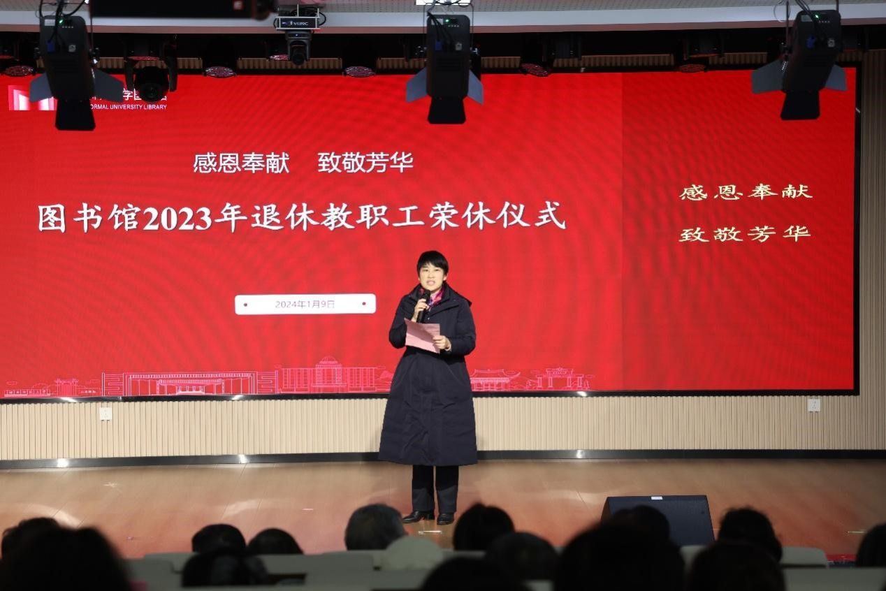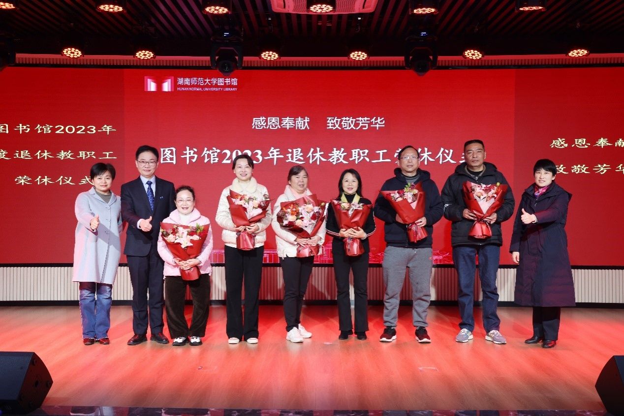 荣休仪式在“感恩奉献 致敬芳华”为主题的视频短片中拉开帷幕,呈现了七位老师在图书馆工作的精彩瞬间以及馆领导和在职职工代表的暖心祝福。党总支书记罗晓慧在致辞中深情回忆了七位老师在图书馆工作期间敬业奉献的点点滴滴,盛赞他们为学校和图书馆建设发展所做出的贡献,表达了对老师们由衷的感谢和崇高的敬意以及美好的祝福。仪式最后,馆领导向荣休老师献上鲜花并合影留念。