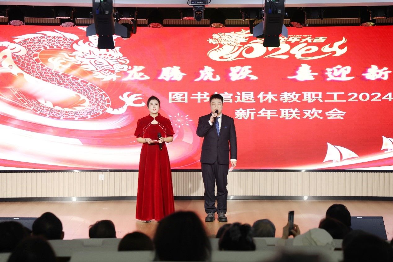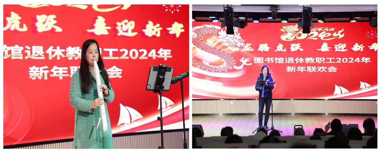 图书馆退休教职工2024年新春联欢会由退休老师和在职老师一起自编、自导、自演,节目形式多样,内容精彩纷呈。退休老师冯宁莎与在职老师曹超双人藏舞《天边的月亮》优美深情,赢得了观众热烈掌声;退休老师吴涛的竹笛独奏《我的祖国》、黄纯喜的二胡独奏《奔弛在千里草原》、罗银凤和王小波的电吹管串烧《琵琶语》《牧羊曲》等悠扬动听,并充分展示老师们丰富多彩的退休生活;在职青年老师的趣味舞蹈《谁是我的新郎》和女职工的舞蹈串烧美轮美奂,高潮迭起;“你说我猜”和“击鼓传花”等游艺活动紧张激烈又趣味横生;联欢会在实力唱将龚晓林副馆长一曲《天边飘来故乡的云》中圆满落幕。