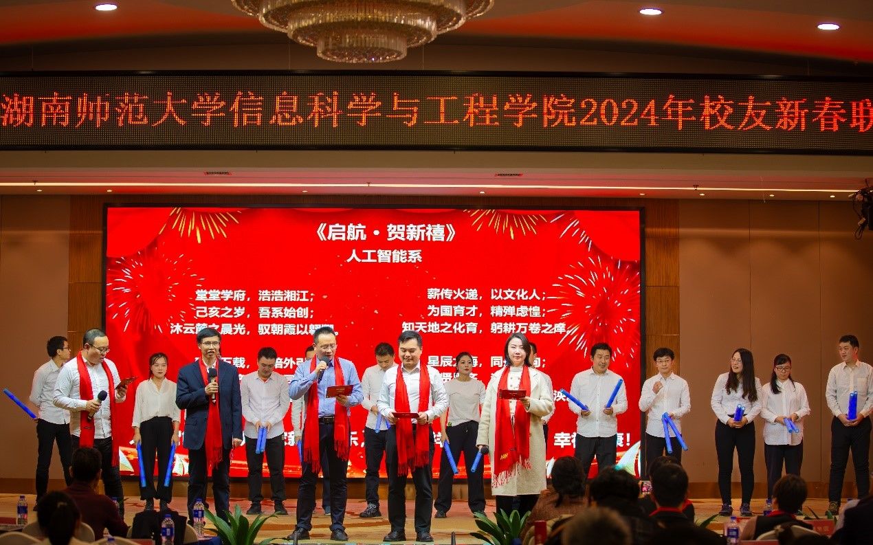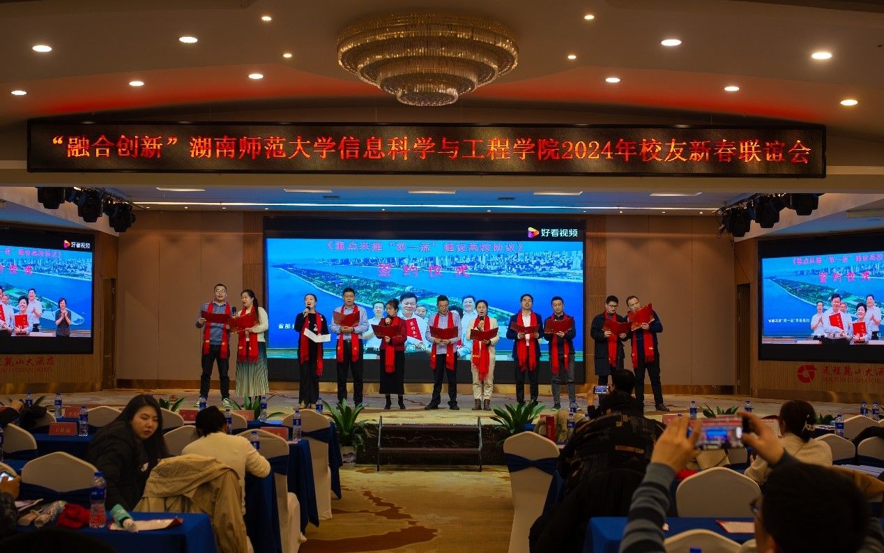 新年伊始, 1月18日,信息科学与工程学院举办了一场别开生面的校友新春联谊会,校党委委员、纪委书记、信息科学与工程学院院长姚春梅,校友总会、教育基金会秘书长黄丽萍以及来自校长办公室,校工会等学校各大部门和学院的领导及代表都莅临现场;此外,中赢合力信息技术有限公司执行董事兼总经理刘坚国,湖南湘子链食品有限公司董事长张丹,新文卓董事长邓星平,中国铁通集团有限公司副总经理张正伟,咕泡教育集团创始人蒋孟枝等信息学院优秀校友代表也都纷纷到场与大家同乐,给予了晚会的大力支持。各位嘉宾、领导、校友以及全体教职员工纷纷欢聚一堂,共同分享着校友情谊和对未来的美好期许。
