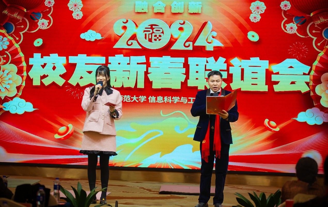 下午7点,晚会厅内灯火辉煌,热情洋溢。在学院副书记周劲松和于抒含老师的主持下,“融合创新2024年校友新春联谊会”正式开始。