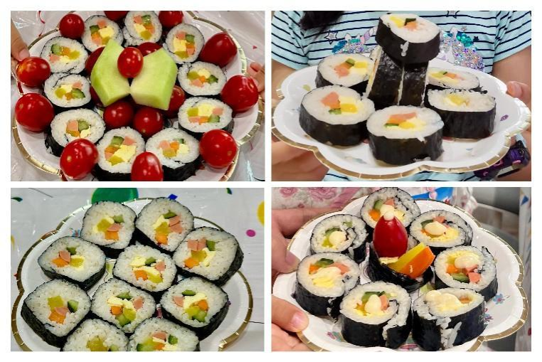 活动伊始,主持人肖婧老师介绍了儿童节以及举办本次活动的意义,随后通过互动问答环节,介绍了世界各国的美食及其文化,让孩子们在轻松的氛围中学习了跨文化知识。紧接着由朝鲜语系卢锦淑老师介绍了紫菜包饭的起源及制作过程,并介绍了韩国其它美食文化,激发了孩子们对多元文化的兴趣。在制作教学环节,卢老师现场演示了紫菜包饭的制作步骤。随后,家长与孩子们分组动手实践,利用竹帘、紫菜、米饭、胡萝卜等食材,制作并摆出创意各异的紫菜包饭。