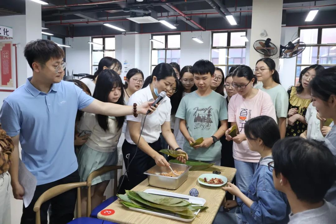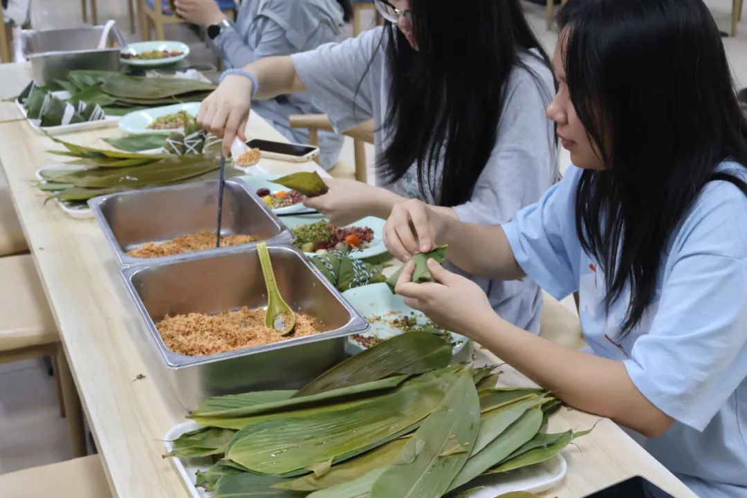 5月29日下午,学生公寓服务中心在二里半学生宿舍4栋(世承书院)院内举办了“青衿裹粽・寓舍传香”包粽子主题活动。后勤人员带领学生全程参与泡米、洗叶、包制、蒸煮等环节,将劳动教育贯穿始终。在包制过程中,后勤阿姨结合生活实例,向学生讲解“一粥一饭当思来处不易”的生活哲学,引导学生珍惜粮食、尊重劳动。活动特别准备的艾草香囊伴手礼,不仅增添了节日仪式感,更融入中医药文化知识科普,后勤人员借此机会向学生介绍香囊驱蚊防疫的功效,将传统文化与生活常识教育有机结合,真正实现“生活即课堂”的育人渗透,让学生在寓教于乐中提升文化素养。