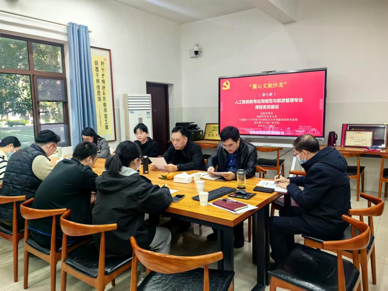 11月27日下午,旅游学院在学院资料室举办“人工智能教育应用规范与旅游管理专业课程思政建设”教学研讨会暨第九期麓山文旅沙龙,旨在以AI教育赋能课程创新改革,以课程思政筑牢育人根基,推动专业建设与人才培养提质增效。院党委副书记(主持党委日常工作)罗明、副院长郑群明出席,旅游管理系相关教师参加会议,会议由旅游管理系主任罗文斌主持。