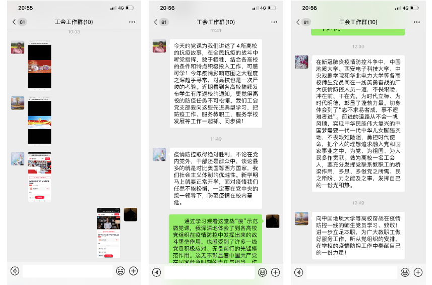 活动中,全体党员认真收看、聆听了四所高校师生党员在疫情期间的抗疫故事,其不畏艰险、冲在前、干在先的精神触动着每一位党员。活动过程中,党支部成员依次通过微信群交流学习心得。